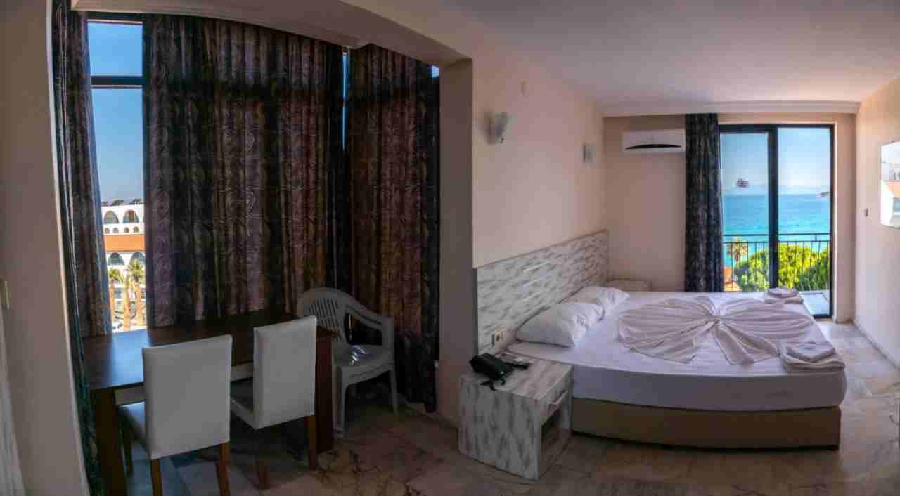 در تمام اتاقها سیستم تهویه مطبوع (کولر گازی) تعبیه شده تا مهمانان در روزهای گرم تابستان، هوایی خنک و مطبوع داشته باشند. هر اتاق مجهز به یک تلویزیون السیدی با کانالهای ماهوارهای است که امکان تماشای برنامههای متنوع بینالمللی را فراهم میکند. همچنین یک یخچال کوچک در داخل اتاقها وجود دارد که برای نگهداری نوشیدنیها، میوه یا خوراکیهای سبک بسیار کاربردی است. یکی از امتیازهای خاص این هتل، وجود بالکن در همه اتاقهاست. برخی بالکنها نمایی رو به دریا دارند که منظرهای فوقالعاده به دریای اژه را پیش روی مهمان قرار میدهد. بالکنها مجهز به صندلی و میز ساده هستند و فضای خوبی برای صرف چای یا تماشای غروب آفتاب فراهم میکنند.