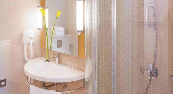 حمام اختصاصی با دوش شیشهای، حوله، سشوار و لوازم بهداشتی