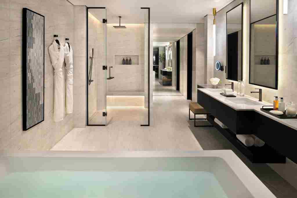 حمام لوکس با دوش بارانی، وان، لوازم بهداشتی رایگان و حولههای نرم