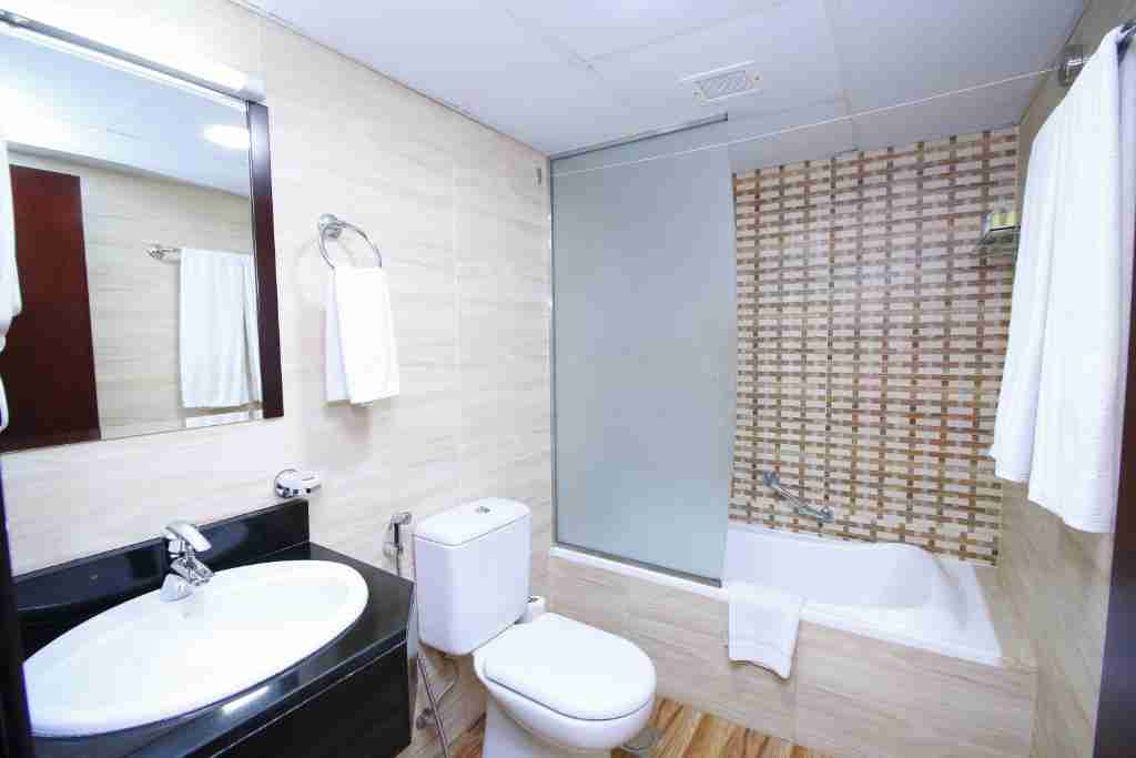 حمام اختصاصی مجهز به دوش مدرن، لوازم بهداشتی رایگان و حولههای تمیز