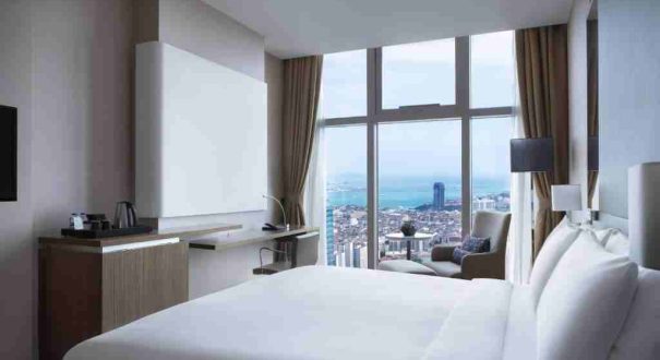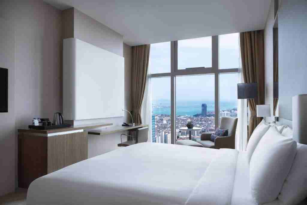 اتاقی لوکس با یک تخت کینگ و نمای زیبای دریا که حس آرامش و کیفیت اقامت پنج‌ستاره را تقویت می‌کند.