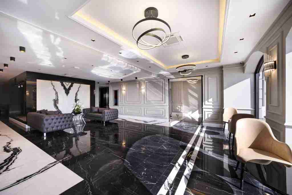 فضای داخلی هر اتاق با کف‌پوش‌های چوبی، مبلمان طوسی یا قهوه‌ای روشن، نورپردازی زرد گرم، پرده‌های ضخیم ضدنور، و تابلوهای هنری خاص تزئین شده است. دیوارها اغلب با رنگ‌های خنثی مانند کرم یا خاکستری روشن رنگ‌آمیزی شده‌اند تا فضای دلبازتر و آرام‌تری ایجاد شود.