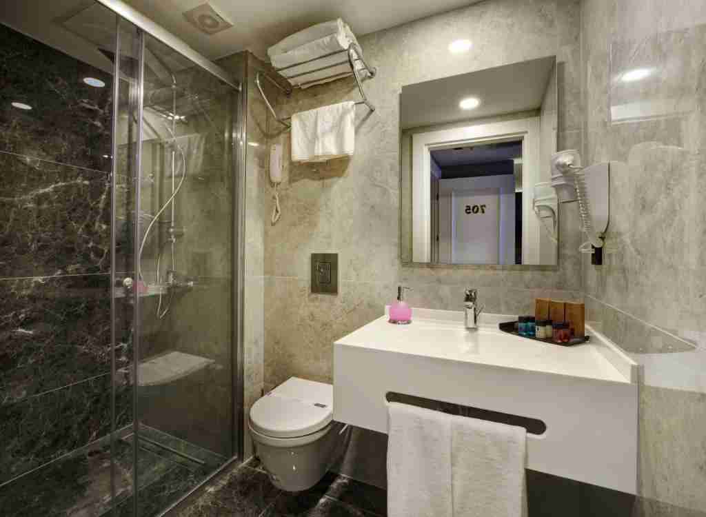 • سرویس بهداشتی اختصاصی با دوش شیشه‌ای، سشوار و پک بهداشتی رایگان