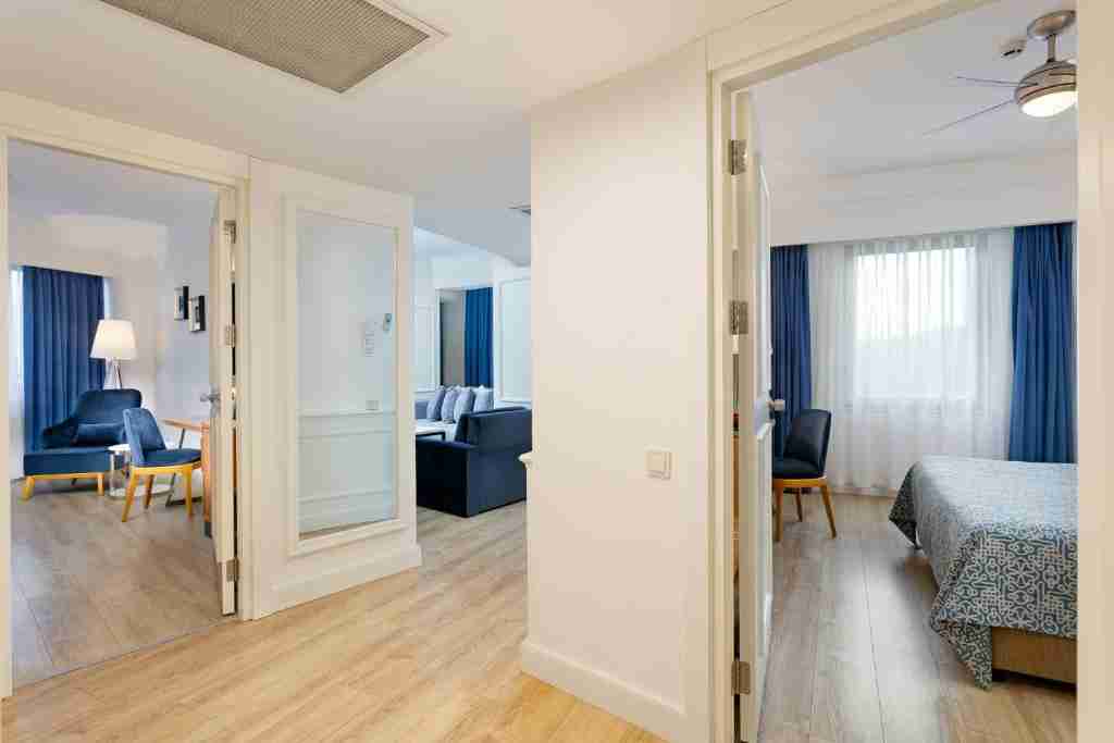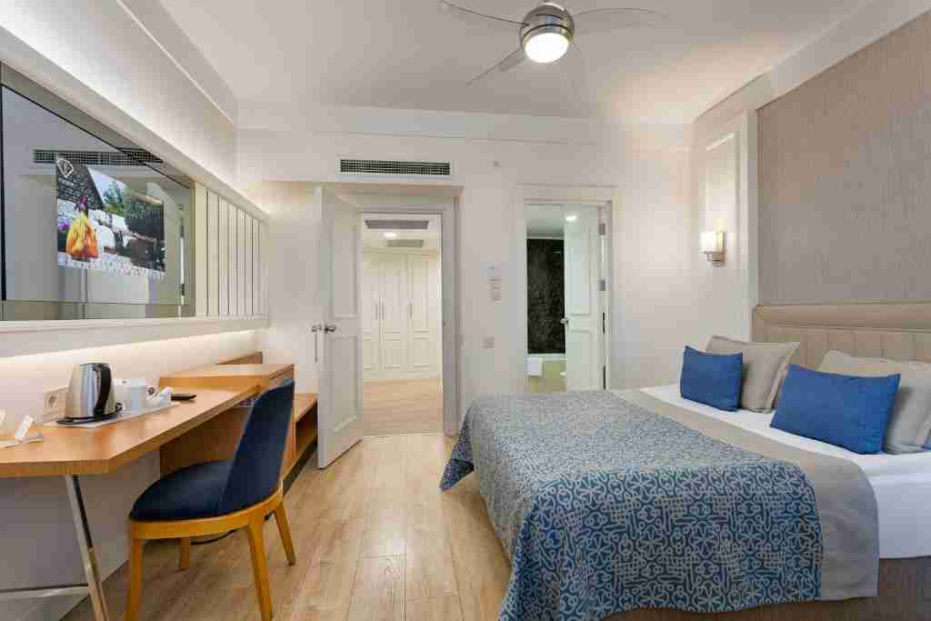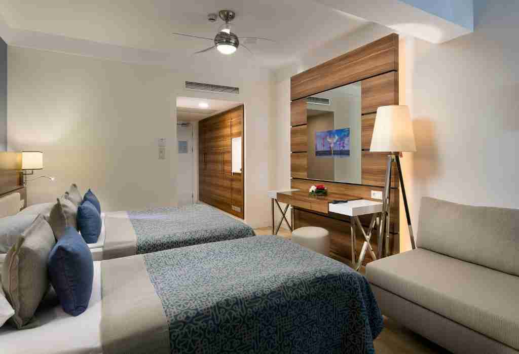 دکوراسیون اتاقها با سبک ریزورتی مدرن طراحی شده است. استفاده از رنگهای روشن، نور طبیعی، کفپوشهای گرم و مبلمان راحت، فضایی دلنشین برای استراحت پس از تفریحات روزانه ایجاد میکند. بسیاری از اتاقها دارای بالکن اختصاصی با منظره باغ، استخر یا دریای مدیترانه هستند که تجربه اقامت را لذتبخشتر میکند.