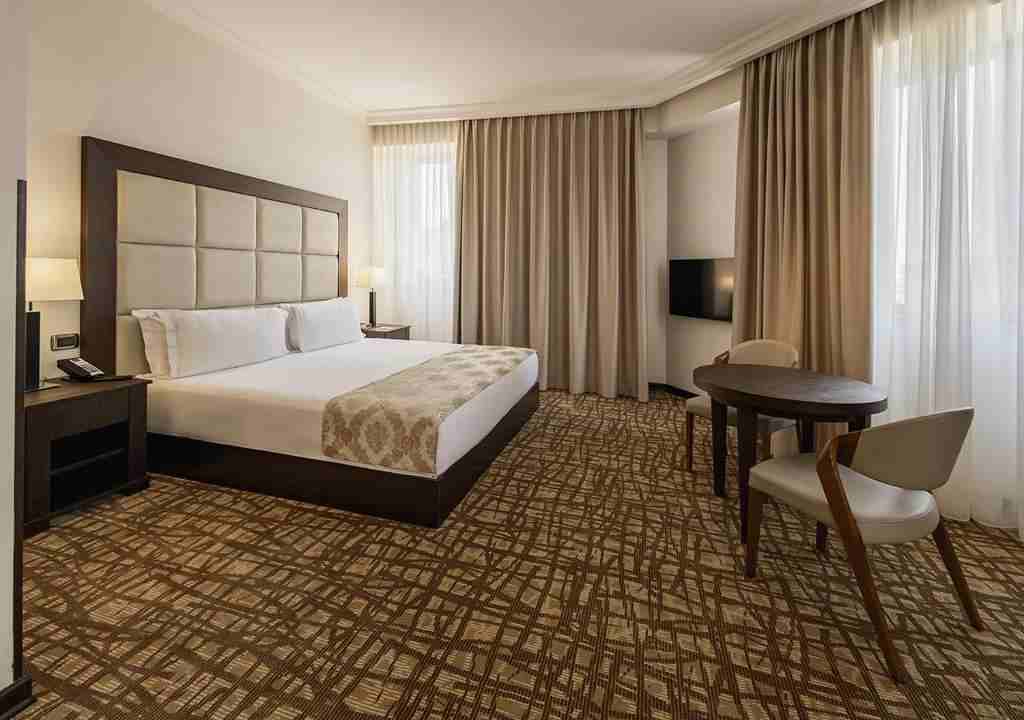 هتل نشنال ارمنستان (Hotel National Yerevan) با حدود ۷۵ واحد اقامتی شامل اتاقها و سوئیتهای لوکس، یکی از بهترین گزینهها برای مسافران خاصپسند در ایروان محسوب میشود. این اتاقها با الهام از سبک کلاسیک اروپایی طراحی شدهاند و ترکیب رنگهای طلایی، بژ و قهوهای، فضایی گرم و باشکوه ایجاد کرده است.