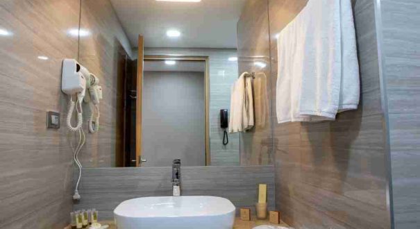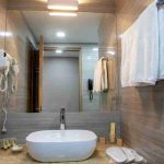 • سرویس بهداشتی مدرن با دوش شیشه‌ای و حوله‌های نرم