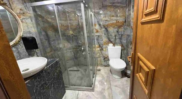 حمام تمیز با دوش استاندارد، حوله، سشوار و لوازم بهداشتی اولیه